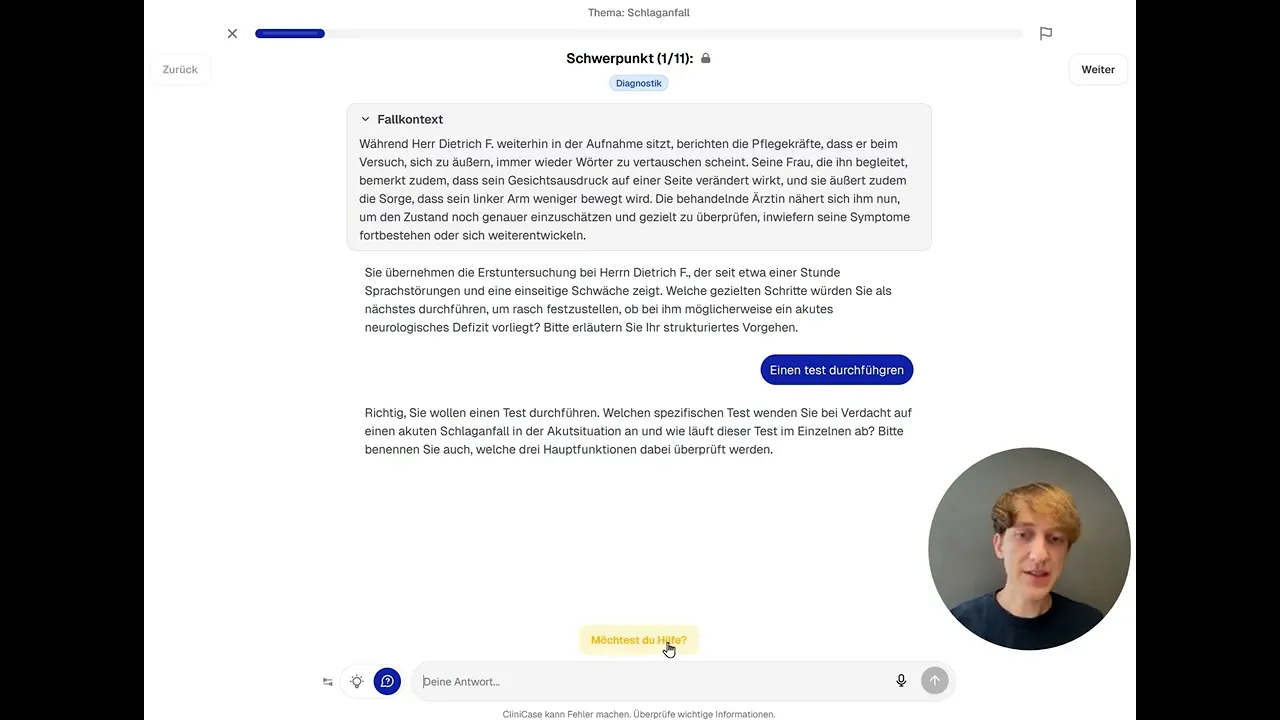Durch KI bietet sich für die medizinische Wissensvermittlung erstmals die Möglichkeit personalisiert und interaktiv Wissen zu vermitteln, an deinem Laptop. Wir nutzen verschiedene Sprachmodelle für die Analyse der Quellen und auch für die Interaktion/Generierung der Fälle. Im Hintergrund gibt es komplexe Systeme, welche die Strukturierung und Systematik der Fallbeispiele vorgibt. Wir bemühen uns die Verlässlichkeit der medizinischen Informationen so hoch wie möglich zu halten. Dafür nutzen wir zusätzliche Evaluationsmechanismen und auch die Verknüpfung der Modelle mit Primärquellen. Unsere bereits vorhandenen Inhalte auf der Plattform, werden regelmäßig von unserer Redaktion überarbeitet. Sprachmodelle können trotzdem halluzinieren und insbesondere deshalb sollten die Informationen der KI nicht für Behandlungszwecke ohne vorherigen Abgleich mit aktueller Literatur/Leitlinien genutzt werden.