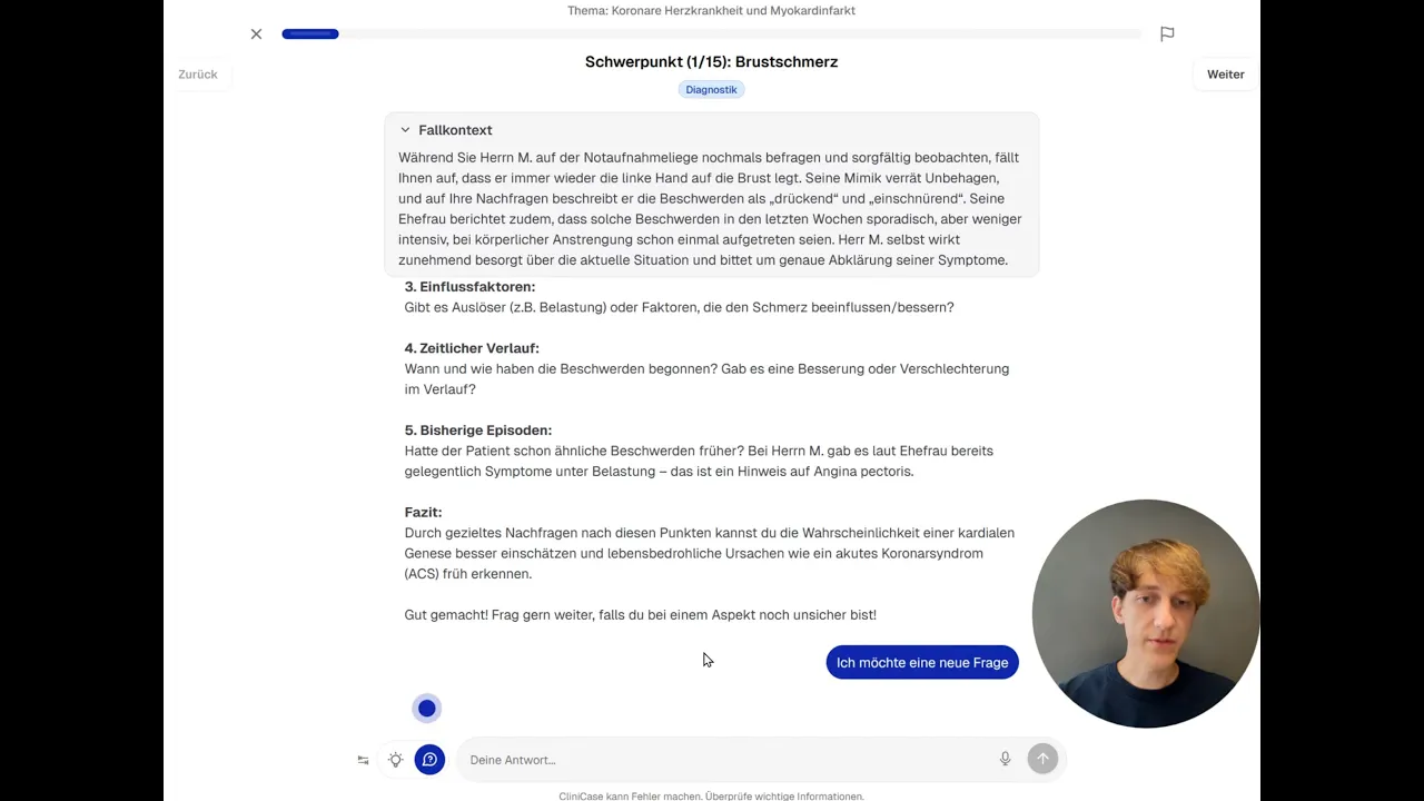 Durch KI bietet sich für die medizinische Wissensvermittlung erstmals die Möglichkeit personalisiert und interaktiv Wissen zu vermitteln, an deinem Laptop. Wir nutzen verschiedene Sprachmodelle für die Analyse der Quellen und auch für die Interaktion/Generierung der Fälle. Im Hintergrund gibt es komplexe Systeme, welche die Strukturierung und Systematik der Fallbeispiele vorgibt. Wir bemühen uns die Verlässlichkeit der medizinischen Informationen so hoch wie möglich zu halten. Dafür nutzen wir zusätzliche Evaluationsmechanismen und auch die Verknüpfung der Modelle mit Primärquellen. Unsere bereits vorhandenen Inhalte auf der Plattform, werden regelmäßig von unserer Redaktion überarbeitet. Sprachmodelle können trotzdem halluzinieren und insbesondere deshalb sollten die Informationen der KI nicht für Behandlungszwecke ohne vorherigen Abgleich mit aktueller Literatur/Leitlinien genutzt werden.